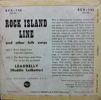 He could play guitar, accordion, piano, harmonica and violin, and had an enormous repertoire which included blues, ballads, spirituals, work songs, protests, and childrens' songs. In 1937 Life Magazine ran an article on him, with the now toe-curlingly un-PC title "Lead Belly: Bad Nigger Makes Good Minstrel." His best-known works feature him accompanying himself on 12-string guitar, and his style was also a great influence on Cyril Davies, until Cyril discovered the amplified harmonica. Ledbetter, like Donegan, was an avid collector and re-arranger of songs, and many titles attributed to him were no doubt acquired either by himself or Lomax in their visits to State Farms and Penitentiaries. The earliest recorded version of "Rock Island Line" gives credit to Clarence Wilson, who was a member of the Rock Island Coloured Booster Quartet, though Lomax, who had also recorded it at the Tucker Prison Farm in Arkansas, usually attributed it to Kelly Pace, an inmate of Cumins State Prison Farm. Miffed at the success of Donegan's version, John's son Alan wrote: "John A. Lomax recorded this song at the Cumins State Prison farm, Gould, Arkansas, in 1934 from its convict composer, Kelly Pace. The Negro singer, Lead Belly, heard it, rearranged it in his own style, and made commercial phonograph recordings of it in the 1940s. One of these recordings was studied and imitated phrase by phrase, by a young English singer of American folk songs, who subsequently recorded it for an English company. The record sold in the hundreds of thousands in the U.S. and England, and this Arkansas Negro convict song, as adapted by Leadbelly, was published as a personal copyright, words and music, by someone whose contact with the Rock Island Line was entirely through the grooves of a phonograph record."