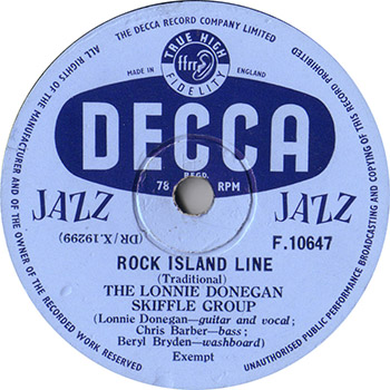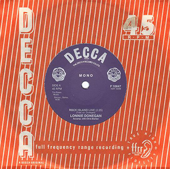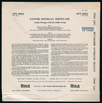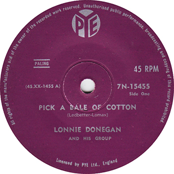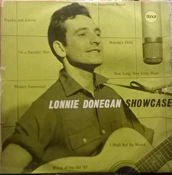 Donegan then moved to the Pye label, quitting Barber's Jazz band, and recorded Leadbelly's “Stewball” (which is not the Woody Guthrie song of the same name, nor the Peter Paul & Mary ditty.) Backed with Leadbelly's “Lost John,” both were credited “Trad. Arr. Donegan,” and “Stewball” made no. 27, but when the disc was flipped, “Lost John” made it all the way to number 2. His following “Skiffle Session” EP, which still featured Chris Barber on bass, included Leadbelly's prison escape song “Ol' Riley” and a cover of the Woody Guthrie version of “Stackalee,” (also recorded by various artists as Stagolee, Stack O'Lee and Stagger Lee,) sung this time by Lonnie's lead guitarist Dick Bishop. The EP reached a respectable no. 20. His next single was Lead Belly's cotton-picking song, “Bring A Little Water Sylvie” (variously credited as 'Lebetter/Donegan,' 'Trad. Arr Donegan,' and 'Arranged By Lonnie Donegan') coupled with Woody Guthrie's “Dead or Alive,” which reached no. 7, and (on re-entry) no. 30. The “Lonnie Donegan Showcase” LP made 26 in the charts, and included Leroy Carr's “How Long, How Long Blues,” “I Shall Not Be Moved” a spiritual which had been recorded by Blind Roosevelt Graves and Charley Patton, and “I'm Alabammy Bound” and “Frankie & Johnny” from Lead Belly's repertoire. Music critic Bruce Eder describes the record as “the first great Blues album to come out of England," praise indeed.