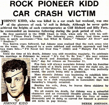 Kidd continued to tour and release singles, including covers of Country singer Marvin Rainwater's “Whole Lotta Woman” and Jewel Akens' “Birds and Bees” though they didn't do much to alter his chart fortunes. But before he could regain a footing in the the Top Forty, tragedy struck. On the 7 th of October 1966, the car he was travelling in was involved in a head-on collision in Bolton, Lancashire, and he died at the scene. Although Johnny Kidd's still best remembered for his home-grown Rock'n'Roll, he remains one of the rare British artists who recognised the attraction and the appeal of American Rhythm & Blues before “Mersey Beat” and the “R&B Boom” of the Sixties got under way.