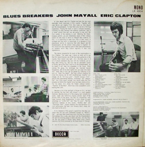 “ In John Mayall and Eric Clapton we have the two most dedicated blues musicians in this country. Together with John McVie and Hughie Flint they make up John Mayall and the Bluesbreakers. To hear them play can be a thrilling experience. Playing the blues is such a complex business, involving so many personal and external conditions, that it is never certain how well you are going to play until the first number of the evening is over. Watching the Bluesbreakers perform you are immediately aware of their intense search for new ways in which to interpret their material. In fact it is surprising to learn how little of their music is arranged and how much is improvised. It is because of this phenomenal ability to improvise that John Mayall and the Bluesbreakers are the premier blues group in England. On this record we have captured some of their best performances on numbers which they feature regularly in their club appearances. The person responsible for much of the improvisation is Eric Clapton. Two years ago I stuck my neck out to say that Eric would become one of the top blues guitarists in the country. Now I know I was right - he is the best, damn it. A lot of people wondered why Eric left the Yardbirds just as they were hitting big. But Eric had an inevitable course to follow, and at the time it led him to the Bluesbreakers, as no doubt it will lead him elsewhere in the future. Since joining the group, his technique has improved beyond recognition, and on his best nights, Eric can make time stand still. Some idea of this can be gained by listening to his solo on "Have You Heard." But even without stopping the clock his playing can be both breathtakingly beautiful and savage, as on "All Your Love" "Double Crossin' Time" and his two instrumental features, "Hideaway" and "Steppin' Out." As if this wasn't enough, this record marks the first occasion on which the Clapton voice has been aired on disc. (Though he WAS singing “Good Morning Little Schoolgirl" with "Sam"on Five Live Yardbirds - Sneaky Stevie) For his debut, Eric chose the Robert Johnson number "Ramblin' On My Mind", which has a very sympathetic piano backing from John. Because a lot of the spotlight is thrown on Eric, we tend to overlook the fact that John himself is a most capable musician. Besides doing all of the singing (well almost!), his piano, organ and harmonica playing provide much of the driving force of the group. His flair for composition, with some unusual chord progressions, is also shown to good advantage on "Little Girl" and "Key To Love." The two harmonica features on this record, "Another Man" and "Parchman Farm" usually develop into tours-de-force in a club performance, but here John remains short, sharp, but very much to the point. It is a measure of this group's capabilities that they can inject new life into such cobwebbed numbers as "What'd I Say", and make them then sound even more vital than the original. And perhaps this is why John Mayall and the Bluesbreakers are the only group in Britain whose music closely parallels that being produced by the blues bands of Chicago.”