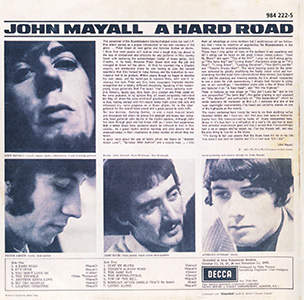 Side One: Trk. 1) “A Hard Road.” Mayall's confessional title track finds him in a melancholy mood, his voice anguished and keening, as he bemoans the turns his life has taken. With ringing piano to the fore, the band is tight and powerful, and for a moment it sounds as if nothing has changed. Then comes the guitar solo, and it's immediately much more economical and understated than anything Clapton might have done in the same place. John's voice and Peter's guitar come to the top as the track fades, accentuating the feeling of isolation inherent in the lyric, a strong song, beautifully arranged and presented. Trk. 2) “It's Over.” This song about lost love is a driving shuffle, pushed along determinedly by the McVie/Dunbar rhythm section. Although the tone of a few guitar licks may seem familiar, the solo's taken by guitar and harp together, working like a horn section, while Dunbar throws in some excellent drum fills during the stops. Another fine cut, enhanced by Mike Vernon's warm, clear production. Trk. 3) Green picks Willie Cobbs' 1960 single “You Don't Love Me” as his first vocal with the band, and what a confident debut it is. He takes the number at a much faster tempo, concentrating on the catchy riff, and leaving the solo spot to John's capable harp, but the soulful voice which soon came to characterise Fleetwood Mac is already there. Like “All Your Love,” this version's become a British Standard that still pops up at gigs and jams. Trk. 4) Peter covers Freddie King's “The Stumble,” and all the weeks standing in for 'God' show here, as Green comes very close to the tone and phrasing that typified Clapton's “Beano” work. John's piano chimes and tinkles in the background, and the rhythm section drives effortlessly. Peter can still be heard playing this one today, though sadly without the fire evident on this evergreen version. Trk. 5) Mayall's tortured voice brings in the strangely dark “Another Kind Of Love,” as heavy brass and riffing organ accentuate a stop-start rhythm which is punctuated by Dunbar's prominent high hat. The guitar is virtually submerged in the mix, until Green delivers a harsh, biting solo, and the brass moves up a register for the final verse. The music creates an ominous feeling, and the subject matter's mysterious, is this “other kind of love” perhaps the one that dare not speak its name? A very moody piece, and sensitively produced. Dunbar used a similar fragmented rhythm, later, to write the haunting “Warning,” which became a 1967 Blue Horizon single for his own band, Aynsley Dunbar's Retaliation, and was covered by Black Sabbath on their debut album in 1970. Heavy! Trk. 6) “Hit The Highway” is a straightforward 12-bar shuffle with a double-tracked vocal and only piano and guitar accompaniment. A nice change of pace, with a pleasantly restrained guitar solo, though it doesn't gel quite as well as as the Mayall/Clapton duets. Trk. 7) “Leaping Christine” features double tracked vocals again, with John this time providing his own harmonies. After one twelve bar verse, it becomes essentially a long, one-chord harmonica and organ workout. Everything's thrown in, including brass, to such an extent that a lot of Dunbar's excellent drumming gets buried in the mix - not a bad track, but one that might have benefited from a more Spartan treatment.