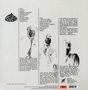 SIDE ONE: Trk 1: "N.S.U." Aaah, the joys of male camaraderie! You join a new group and first thing you know, one of your band-mates has written a song dedicated to your current sexually-transmitted disease. This, it seems, is how 'N.S.U.' ( short for 'non-specific urethritis') came into being. Pounding toms and lightly tinkling guitar introduce an almost whispered verse about the joys of being a guitarist with the clap, before the band explodes into a sequence of vocal harmonies and power chords which breaks down, re-starts and builds up again until Eric finally lets fly with a biting solo. The mix is murky, but I'm pretty sure there's a sustained guitar note filling out the sound in the background, and that's a trick that's repeated on later tracks. The last set of harmonies resolves to a gentle, melodic ending which tails off and fades just as Ginger puts his sticks down. The verse itself is nursery-rhyme simple, and the number's really little more than a vehicle for Clapton's sizzling guitar, but overall it's an interesting combination of forcefulness and melody, quite powerful without being "heavy." Trk.2: "Sleepy Time Time." Written by Bruce with lyrics by then-girlfriend Janet Godfrey, this is in the mode of a stop-time slow blues, though the sequence is unusual - it goes up to the 'four' twice, turning it into a 16-bar Blues. Bruce and Baker inject some little tricks of timing which can deceive the listener into thinking the breaks are longer than they really are, but I've counted the bars (yes, really, like I've got nothing better to do!) and they're all even. Bruce's vocals are very subdued on the verse, but rise up strongly on the chorus, which seems to be double tracked. Clapton's guitar is double-tracked too - the tone and style is reminiscent of 'Telephone Blues,' a track he recorded with Mayall on the B-side of 'I'm Your Witch Doctor,' produced by Jimmy Page. Undeniably a British Blues, and quite an original one, too, this gets top marks. Trk.3: "Dreaming." Delicate and lilting are not terms usually reserved for power trios, but they apply to this unexpectedly pretty tune of Bruce's, which at 2.02 is the epitome of short and sweet. Gentle-voiced Jack echoes himself in the verses, and there's a brief solo section where guitar and bass follow each other languidly up the scales before returning to the middle 8. It's not Blues, but I like it. The overall feel is surprisingly smooth and lush, probably not one that would have inspired many Heavy Metal bands. Trk. 4: "Sweet Wine.” This tribute to wasted time was written by Baker with Jacks wife-to-be, Janet Godfrey. Originally the secretary of the GBO Fan Club, she'd already co-written two songs with Bruce for the band's 'Sound Of '65' LP (also in our collection of Classics.) Like 'N.S.U.' this features Jack on lead vocal, and relies again on the strength of combining harmonies and power chords, held together with Baker's inimitable drum fills. Eric contributes a fiery double (triple?) tracked solo, which again uses feedback and sustain laid back in the mix to fill out the sound of the trio. Trk.5: "Spoonful." Jack's in passionate voice on this Howlin' Wolf cover, and he allows himself the luxury of overdubbing harp on the riffs and behind Eric's shredding, feedback drenched solo. But rather than being “backing musicians,” what Bruce and Baker are doing behind Clapton is just as dynamic and exciting, and all three play with tremendous force and fluency. More importantly, they don't forget when to bring the damper down, so the tension in the song is not lost in overkill. The sound they create here will soon give birth to Blues/Rock in all its Stadium-filling horror, but for now they're just three young white guys playing a new and very electric kind of Blues. Simply terrific. SIDE TWO: Trk.1: "Cat's Squirrel" is credited to “Trad. Arr. S. Splurge,” thus ensuring no royalties would go to the rightful composer, Isiah Ross. Dr. Ross (The Harmonica Boss) recorded Cat Squirrel (sic) for Sam Phillips on Sun in 1953 as a one-chord acoustic Blues with a washboard accompaniment. In 1961 he re-cut the song for Fortune, in an almost-rockabilly version, as Dr. Ross & The Orbits, so it's hard to say which one would have been the influence on this arrangement, though both use the same repeating rhythm guitar figure as a focal point. Here Cream play the number as an instrumental, featuring tight, unison guitar and harmonica, and on hearing it in this presentation I'm struck by the resemblance to Muddy Waters' “You Need Love.” Although it's taken at a different tempo, Ross's 1953 Sun recording has a similar verse structure to Muddy's 1950 'Catfish Blues' (aka 'Rollin' Stone.') Muddy seemed to like that structure, and revisited for his 1951 'Still A Fool' (aka 'Two Trains Running') and again, with a repetitive backing riff, for his more uptempo 1953 recording of 'She's Alright.' In 1962, after the success of 'You Shook Me' a vocal he overdubbed on an Earl Hooker instrumental, he repeated the process with 'You Need Love,' the song that eventually became the inspiration for Led Zeppelin's famous (notorious?) 'Whole Lotta Love.' Whether Hooker had Muddy's previous recordings in mind when Leonard Chess asked him to cut the track, I can't say, but presenting Cat Squirrel in this form certainly highlights some of the similarities. Meanwhile, back at the track, there's a quick chorus of "alrights" from an acapella Jack before Eric launches into his solo (though it sounds like it's been done in two takes which overlap, so one's clicked out and rather clumsily replaced by the other.) The guitar's punctuated by Jack's harp flurries, and they return to the verse and the repeated rhythm guitar figure, before it all disappears into a fade out ending. The result is a striking and rather unusual Blues instrumental, which was also recorded by Jethro Tull in 1968, and reprised by super-speed ex-Tull guitarist Mick Abrahams in his later band Blodwyn Pi