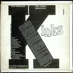 Side Two Trk.1: “Cadillac.” Ray leads a very appealing cover of the Bo Diddley song, and blows a tasty harp solo too. Nicely done, lads! Trk. 2: “Bald Headed Woman.” This is an old chain gang work song, adapted and recorded by Odetta on her 1959 Vanguard album "My Eyes Have Seen." Here it's 're-written' by The Kinks and Who producer Shel Talmy, probably so that he could get some songwriting royalties. It's an interesting experiment but it doesn't doesn't really come off. Jon Lord is credited with organ, and Perry Ford contributes some Nicky-Hopkins style piano, but even the expanded line-up, and key and tempo changes, don't disguise its overall drabness and lack of conviction. Talmy persuaded The Who record it as well, and the real Mr Hopkins, who'd played beautifully on The Who's debut album, enlivens that one a little. but still nothing can completely save it. Then, like a bad penny, the darn song turns up again on the B side of the Talmy-produced cover of “I Just Can't Go To Sleep” by The Sneekers, which also had Jimmy Page playing on it, confirmed by both his sound and his website. Sadly, he doesn't save it either. Trk. 3: “Revenge.” A monumentally monotonous instrumental credited to Ray Davies & manager Larry Page. Biographer Johnny Rogan states that Page had been tutoring Ray on the importance of simple, straightforward guitar riffs as a blueprint for chart success. “Revenge” then presumably served as some kind of prototype for many of the musical ideas that were to follow. But are they really singing 'Aye-Aye, Yippy' in the background? Recorded as a single by the Larry Page Orchestra in '65 and The Ray McVay Sound, but never a great hit. Trk. 4: “Too Much Monkey Business.” Ray, double- tracked, sings this tongue-twisting Chuck Berry number, rather the slacker's anthem of the sixties, and beloved of both Mersey Sound beat groups and hip R'n'B bands in the UK. Somebody - and it could easily be Dave- throws in couple of Berry-ish guitar solos, a creditable effort. Trk. 5: “I've Been Driving On Bald Mountain.” A very eclectic and unusual choice, again from Dave, this time an 8-bar Blues, with acoustic 12-string provided by Page. Once again it's taken from Odetta's 1959 album "My Eyes Have Seen," though it miraculously gets credited 'Trad. Arr. Talmy' here. Speeded up a little from the original and translated into the chunka-chunka that's becoming the standard Kinks R&B rhythm. Trk. 6: “Stop Your Sobbing.” The rather Spartan treatment the song is given here undersells it considerably. A beautiful cover version by Kinky Konsort Chrissie Hynde, a debut single for her band The Pretenders, gave it back the power and emotion it had always merited, and reached 34 in the charts in 1979. She also recorded a haunting version of Ray's demo-only "I Go To Sleep," previously given to Brumbeat band The Applejacks, but without chart success, and took it to a very deserving Number 7. Trk. 7: “Got Love If You Want It.” The jewel in the crown of this album for Blues lovers, this is very successfully and sensitively handled. Ray sings passably like Slim Harpo, and the band keep their dampers well down until the Yardbirds-style "rave-up" section. Session drummer Bobby Graham is usually credited with most of the album, and the understated rhythms that later develop into total Moonacy here are a tasty piece of work, but there's a corking live version from The Beat Room that turns up on Blues at the BBC every so often which suggests that Mick Avory could cope with it well enough. A lovely example of the band's ability to handle "dynamics," this shows just how effective they could be as a straight R&B group.