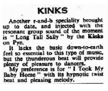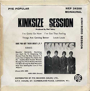 EP November 1964, “KINKSIZE SESSION” Trk.1: “Louie Louie.” The Kingsmen's classic garage cover of Richard Berry & The Pharaohs' R&B hit plainly had a strong effect on both the Davies brothers, with Dave citing it as an influence on “You Really Got Me,” so it was inconceivable that they shouldn't attempt their own version. Ray puts an unusual inflection of the first 'Louie,' and Dave's distorted guitar solo is very similar to the Kingsmen's own. At the end, it's four strikes and they're out! Trk.2: “I Gotta Go Now.” This opens with laid back drums and a bluesy guitar riff, rather like "It's All Right" cooled down and played backwards. Ray coos the vocals almost like a lullaby, and brings it in with a catchy chorus. It's lifted by a brief middle eight which takes the intensity up into high gear before it settles back to the verse and fades out on the drum beat. Both unusual and striking. Trk. 3: “I've Got That Feeling,” is a somewhat mournful ditty, but moves away from the Beatley sound of previous offerings and begins to establish a Kinks Sound. Still, there's more R&B to follow. Trk. 4: “Things Are Getting Better” is similar in structure to both Bo Diddley's “Cadillac,” and Rufus Thomas's 1964 recording “Jump Back,” more recently known as the Lavazza Coffee Advert song. Though it's largely forgotten now, it was a great favourite with British R&B bands in the 60s and was covered by The Spencer Davis Group and Zoot Money's Big Roll Band. Like both numbers, the verse here is punctuated by the infectiously constant repetition of the title line, and Ray throws in a bluesy harmonica solo. There's a genuinely celebratory feel to this one, and it's quite uplifting.