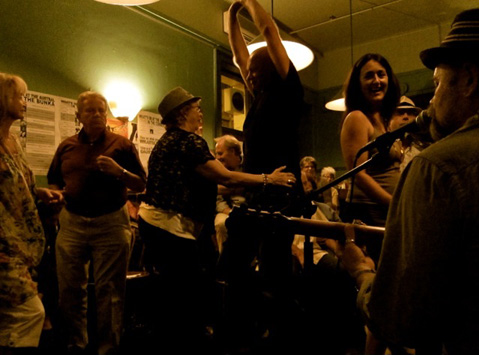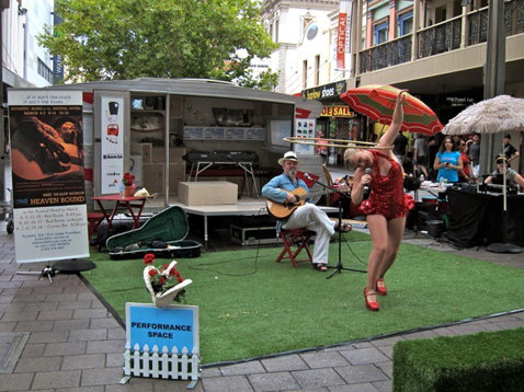 The conductor (who also is the hoola hooping MC at the Caravan) is dressed as a rather disturbing Australian Girls Scout outfit. The bus is adorned with a range of warning signs such as ‘no pole dancing' and ‘no diving'. The journey degenerates into a zany improvised show with the rather bemused passengers singing along and dancing to a special song I wrote especially for the festival called the ‘Torrens River'. This song caused a few moments of confusion for me early in the run. The Opening lines of the song are: “I'm going down to the Torrens River I'm going to lay my body down, I'm going down to the Torrens River I'm going to lay my sweet head down”. The first couple of times I played this, the audience laughed. Instead of a friendly homage to the city (the Torrens River runs through the city), it turns out that the song has an altogether more sinister meaning. The Torrens River, it turns out, is a popular dumping spot for bodies, murdered by the local criminal community!