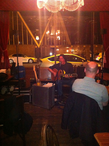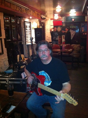 Listen to Chapter 12 Late autumn leaves are hanging onto the trees, Aretha sings a ‘little prayer', as I sweep onto the A1 heading north from Leeds. Blue skies and sunshine lifts my spirit; side winds on the exposed section near Rippon, remind me to pay attention. Bill Withers sings, “I know I know I know” as I cruise towards Durham. I had spent the previous two days traveling ‘up country' with Sameena, stopping off in Felixstow, Norwich and Leeds to see family. I had said goodbye to her in Leeds, as she had to head back south on the train for a gig in London. I was driving north to Edinburgh for the first of three gigs that Gary Grainger and I were performing together, two solo shows on one bill. Gary had wanted to call it the ‘Road to Hull Tour', but a gig in Hull had fallen through, as had a gig in York! I think we can get away with calling it a short tour! I was looking forward to spending a couple of days in Edinburgh meeting friends and spending time enjoying a city I have come to know and love. The moors of Northumberland rolled out ahead; a stunning prospect also, was a brief sight of Lindisfarne and the sea off the east coast. What a day to be on the road. Our first gig of the run, was in a venue I know well. The Blind Poet and the Pear Tree pubs are part of a larger complex of old buildings that are a hive of activity on most nights of the week. During festival (in August) they host a wide range of comedy and music, including gigs in the garden (see chapter 8), which is a popular watering hole for performers and punters alike. You can see a picture of Alex Petty, promoter and stage builder extraordinaire, in Chapter 8 of this diary, setting up the Counting House stage (upstairs from the Pear Tree). Gary and I set up to play in the Blind Poet on a wet and rather gloomy night. I kicked off the night to a quiet house. A surprise visitor was Sandy Tweeddale, a great guitarist and Scottish blues- scene stalwart. I have seen Sandy play a couple of times, he always delivers a great driving guitar sound, often balanced with some subtle touches. I was pleased to see him, discovering as I did that he is old mates with Gary. The night picked up when Gary went on stage, the audience responding well to Gary's banter and ‘old school' guitar style, picking and strumming his way through an eclectic set of blues and Americana. The set featured a wonderfully sounding Teleresonator, (seen in the pic below), a beast I definitely want to get my hands on! Gary and the Teleresonator Gary and I parted company with a handshake, standing on the rain washed cobbles outside the Pear Tree. The streetlights reflected on the damp road, lit our end of gig debrief and farewells. Gary wanted to get back home (a three hour drive), as he had stuff to do the next day. I know some people think performing looks fun- it is, but the traveling can be a pain. The following day I held on in Edinburgh to pick up the fee, before heading south to Newcastle. I was looking forward to playing the Monkey Junk session at the Butterfly Cabinet. I was intrigued by both the name of the session and the venue. On arrival it turned out to be a large, rather quirky, vaguely French style cafe. The audience was keen, quiet and attentive, listening and applauding with enthusiasm. It was great to perform a concert rather than provide a sound track to somebody elses' night out. The gig was a great success, both of us left with offers of more gigs. I have been trying out a new amp, an Acus acoustic guitar amp. It is proving to be a great asset, producing a good clean sound. Compact, with a great digital reverb. I really enjoyed what it is doing with my Boucher, and the richness and edge it gave to my resonator. The third gig was a real surprise and a gem. The Half Moon in Darlington is a pub, recently opened by two home brew enthusiasts. John Anderson and Dave Walker were gracious hosts who had even named one of their beers after me. I was so chuffed. The pub was rammed with a lively and enthusiastic crowd, all enjoying the beer, the music and the buzz.