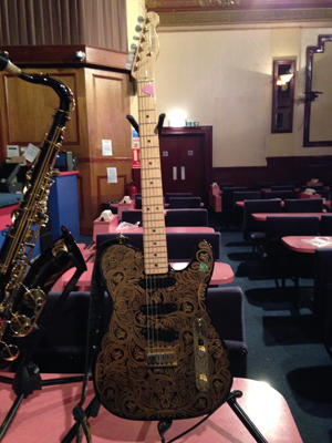 Baz Simpson I asked Baz what he was doing in Edinburgh and he replied in his characteristically direct, deep resonant brogue, that he is local, and further: “where else would you want to be in August?” Baz describes his musical roots as Folk. He has an uncle Jim who was always playing guitar at home. Jim now lives in Liverpool and is a folk singer in his own right. Baz' gran was Irish, and her house was always full of music. For Baz it was ‘folk music first'. Baz' interests are broad and eclectic: blues, rock and roll, jazz and blue grass. His influences (not surprising if you ever get a chance to hear Baz roar the blues) are: Howlin Wolf, Skip James, Screaming Jay Hawkins, Little Richard and “of course” (Baz)- Muddy Waters. Baz runs the popular and well-attended ‘Wolf Sessions' in the Blind Poet, another bar that forms part of the Pear Tree/Counting House venue. After three years with a format of three guests and a headliner, Baz is constantly approached by people “annoying me to get booked!” In the future, Baz wants to record a couple of albums, a solo acoustic recording of his own earlier material, and a band album. Baz described how the stuff he is doing is changing and he wants to get it down, get it catalogued. ‘Music is a journey'. In the last 5 years there has been a change as his material develops. I asked Baz about the music scene in Scotland. He said there was a lot in Edinburgh and Glasgow. He described the big traditional scene up in the Highlands. Baz talked about his musical roots, influenced by his Irish background. We both share an Irish heritage and Irish musical roots, laughing as we did when remembering listening to and playing ‘Diddly Diddly music'. This was fondly remembered and loved, the Irish music of our grandparents, music that helped to mold our current performance of and love of the blues. If you get a chance to hear Baz take it, he is a true original and an awesome presence on stage. One of the more unusual gigs I was asked to do was a Ukulele showcase at a wonderful old Burlesque theatre, now a Bingo hall, the old Princess Theatre. Built in 1859 as a Variety and Burlesque theatre, it was converted into a cinema in 1912. It was also the most unlikely place to come across a piece of Rock and Roll history- James Burton, Elvis Presley's guitarists' custom Telecaster. Owned and played now by ‘Scotland's veritable Monarch of Rock and Roll'- Jesse Garron. It was on a guitar stand at the front of the stage, where Jesse had been rehearsing.