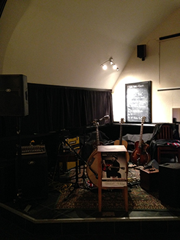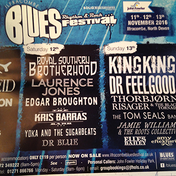 Stage set up Ilfracombe Blues Festival Saturday line up The gig was great, a packed holiday camp caberet bar with a warm, generous crowd. I had the chance to chat to the folks after the gig and sell a stack of CDs. The performance of Silent Man went particularly well, it made a woman cry, (apparently in a good way!). I packed the gear away and then got to hang out and have a couple of beers before a very long and much needed nap. I have two rules when I am out gigging, eat well when I can, and sleep when an opportunity arises. My father could sleep anywhere at any time, and I seem to have inherited this ability. After waking up I grabbed something to eat before watching The Southern Brotherhood, who delivered a tight rocking set that got the crowd up on their feet dancing. I discovered that King King were now not playing on Sunday, I wouldn ' t have been able to see them as I had a gig on the Sunday afternoon. I was sorry to hear that King King ' s lead singer was unwell and needs to rest. I wish them well. I hope to see them soon, I have heard so much about them but have not yet managed to catch their set.