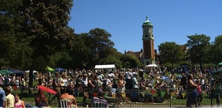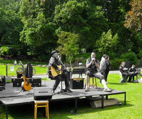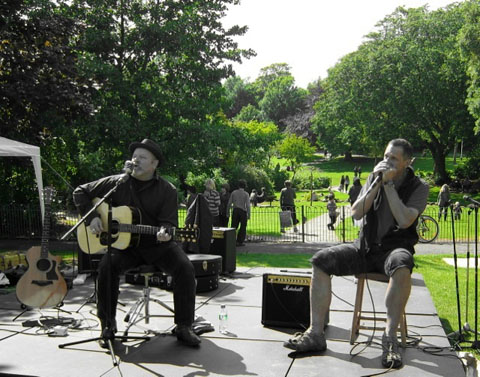 Brighton Picnic in the Park I had a couple of gigs before we headed north. The first was at the Mid Summer Festival in Ilford (Essex). The stage is set up in a local shopping centre and showcases local talent. It was a gloomy day but the performers put a smile on the faces of the shoppers, many who stopped to listen in the rain. My set went well, and as I was warming up to finish, my good friend Chris Wyatt (one of the organizers) sidled up and asked if I could keep playing, as the next act had rung to say they were stuck in traffic. Not needing to be asked twice, I carried on! Down to Brighton on the following day, to play at the Picnic in the Park. This was a community event held in Queens Park, up at the back of Kemp Town. The venue was a natural bowl in the park, surrounded by trees and ringed by a collection of stalls. The stage was a raised platform with no cover. I was equally pleased (good sight lines) and appalled, (rainwater and P.A.'s!) in equal measure, but impressed by the organizers faith. I need not have worried, as the clouds parted, and the sun started to shine when I took to the stage. I had invited Pete Durgerian an old musical acquaintance of mine to join me on harmonica. Pete is a local musician I have known since the late 70's. Pete is a great singer, guitarist and harp player and we had a ball.