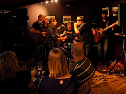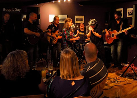 Dr blue blowing harmonica with Jimmy CB I headed back to the Chambers because I wanted to see Kat and Co who, I had missed the previous night. When I arrived, Kat had just finished her sound check and was surrounded by photographers clicking away. She got up and started her set, immediately trying to bridge the gap between the stage and the audience. This women is an experienced performer, immediately connecting with the audience: ‘You want this” she challenged the audience? Kat prowled up and down the stage like a panther, proclaiming to the punters, it was like a revival meeting, every so often catching the eye of the crowd over a shimmying shoulder. I moved on to Connoys, a bar across the road to try to watch Blues Positive. Another lively crowd was enjoying the music. Sadly the harmonica of the lead singer was drowned out by the rest of the band. The only place I could find to watch was by the entrance to the toilets and quickly discovered why it was vacant, the drains were obviously not coping, and I went outside to join the smokers in the fresh air. I headed off to a nightclub located to the North East of central Dundee. You entered the main premises via a lift, and I was immediately transported back to the 1970's, as I stepped into the disco ambience of ‘Soul'. Snakewater were well into their two hour musical romp, they were a playing a rock solid, driving- blues inspired set. Certainly the clearest and best sound I had heard anywhere in the festival. This Manchester based three- piece band were a class act - keep an eye out for them. They had apparently missed the previous years festival because their van broke down on the way up to Dundee.