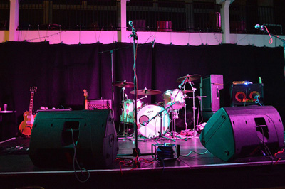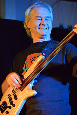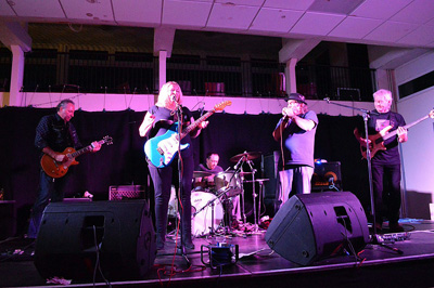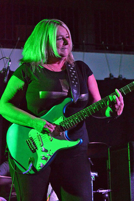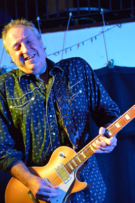 BAD INFLUENCE @ THE NEW CRAWDADDY 17/10/2014 (Photography by Beckie Howes) Bad Influence was founded in 1986 by vocalist/guitarist Val Cowell and slide/lead guitarist Richard Hayes. The rhythm section has been subject to some change over twenty-eight years, and current members are Harry James (Thunder, Magnum) on drums and Pete Stroud (Papa George, Peter Green, Buddy Whittington) bass, though tonight Harry is busy and Clive Jenner (Proclaimers, Groove Armada) sits behind the kit. They've released five (or is it six?) CDs to date, and play an average 100 gigs a year, at venues of all sizes, from festivals and clubs to pubs and parties, sometimes appearing in a duo or trio format. Val also performs with with Sam Kelly's Primo Blues Band. The atmosphere's a little different when I visit the Crawdaddy after The Heaters frontman Paul Milligan's recent resignation from both the band and the club. Drummer Paul Reynolds and bassist Chris Patchett are both still there, along with keyboard man Paul Dean, who doubles as the club's booking agent, but the Milligan brothers are conspicuous by their absence, and the large banner on the backdrop that proclaims the club's long-established name is also missing. I quiz Paul D about the future, but he won't be drawn, except to say that he hopes the Heaters will play again, and that the club can continue, but that he intends to takestock when the venue closes for its annual Xmas/New Year break. The Heaters and The New Crawdaddy Club have been a stable constant in Essex Blues for the last fifteen years, and it's hard to imagine the place without them. Tonight, however, there is no support band, and Bad Influence are to play both sets. As I survey the scene from behind a glass of house white, I see some classic “kit,” two vintage Vox amps, a blue Strat, a Les Paul Goldtop and a set of Ludwig drums – only the ubiquitously modern Mark Bass stack seems out-of-place, the rest is timeless rock gear. Richard Hayes comes on to tune up, sporting an eye-catching Peerless with a gold sparkle finish, followed by Pete Stroud and his personalised fretless, and as Clive Jenner seats himself behind the kit, Val Cowell straps on her blue Strat and takes centre stage. The stage before the gig Val's pretty eye-catching in her own right. Blonde, and buxom almost to the point of being Amazonian, she commands the stage as the band launch into “I'm On Your Side,” a rocking, 16-bar shuffle which gives instant confirmation of her rich, soulful voice and Richard's tasteful slide guitar. What comes across strikingly and almost immediately is how much these people are enjoying themselves, and that rather refreshing sensation communicates quickly to the crowd, even to this curmudgeonly critic. The next song is “Fly,” the lead track from their 2005 album “Closer.” Kicking in with a catchy guitar riff, at a tempo like a John Lee Hooker boogie, it's “the story of a woman who's always on the road.” “You might think it a little strange,” Val sings, “still rockin' at my age, but I know that you would do it if you could,” and I'd say “amen” to that, though unfortunately at this point I can't actually hear the words. The vocals lack clarity, though by way of compensation, Richard's dazzling bottleneck becomes the focus for an extended instrumental workout that provides the climax. Pete Stroud (bs/vocs) As it ends, Val confesses there are problems with the monitors, and these are swiftly remedied in time for the slower, more melodic “I Hope” which Keb' Mo' co-wrote with the Dixie Chicks. There's a gospel feel about it as bassist Pete joins in on the choruses, and the band deliver this touching and tuneful piece over an infectious, pumping beat. “That's one of the covers on our Carousel CD,” Val announces, “and this is the other,” introducing Randy Week's “Can't Let Go.” Though Cowell credits the song to Lucinda Williams, their interpretation's less overtly countryfied than hers, and considerably more restrained than the sledgehammer Beth Hart/Joe Bonamassa version, though none are as minimal as Week's original. Richard offers some nimble soloing, and in the extended finale he seems to be competing with drummer Clive to see who can hold out longest without actually ending it. Next in line is Delbert McClinton's “The Jealous Kind,” the Country influence reinforced as guitars replace the electric piano and sax of the recording. Hayes' understated slide solo earns spontaneous acclaim from the audience, and Pete Stroud slips in some elegant bass improvisations on the outro. Val Cowell (gtr/vocs) After so many eclectic covers, the inclusion of Stevie Ray Vaughan's “Pride And Joy” is quite unexpected, but the band's take on it is much more relaxed, and almost jazzy. There's a real sense that these guys are just jamming, but that they're so familiar with one another, there's never a note out of place, and they work the number up to quite a climax with chorus after chorus of soaring slide. As the applause dies away, Val's Strat strums out the intro to “If It Hadn't Been For Love,” written by Chris Stapleton and Mike Henderson, founder members of Bluegrass band The SteelDrivers, and more recently popularised by Adele. Cowell's expressive vocals give way to an angry guitar solo, punctuated by Jenner's fluent fills, and as the song ends the drums take over, his touch becoming gradually lighter, till he slows and fades, like a clockwork toy winding down. The audience response is tremendous. Clive kicks himself back into life to lay down a funky intro for a re-arrangement of Ray Charles' “I Got A Woman,” the gender of the lyric suitably reassigned. The maturity of the musicianship, and the ease with which these guys spark off one another, gives a new lease of life to even these hoary old standards. The kick that they get out of working together is so obvious that, though they've been together nearly thirty years, you could never accuse this band